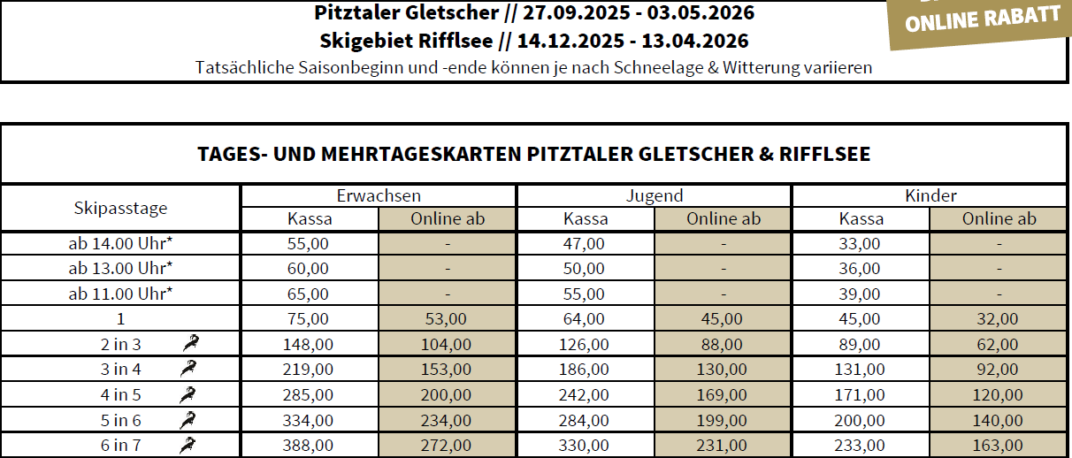 LISTINO PREZZI SKIPASS 2025 - 2026 PITZTAL
