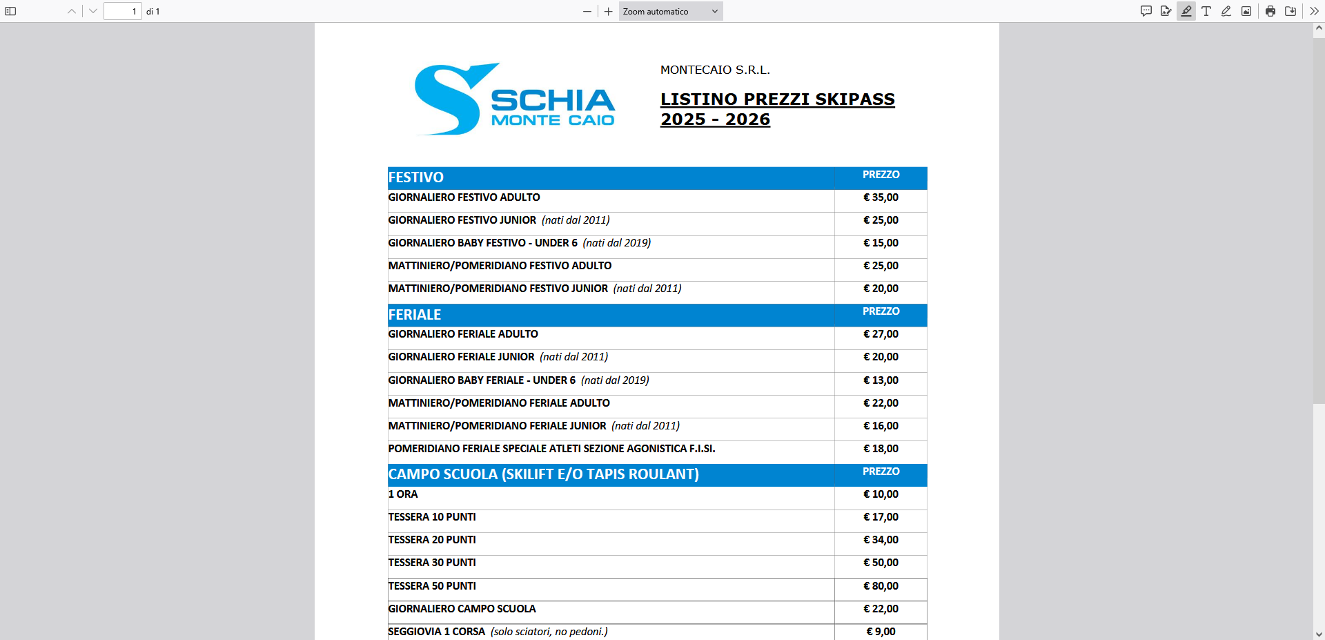 LISTINO PREZZI SKIPASS SCHIA MONTE CAIO 2025 - 2026