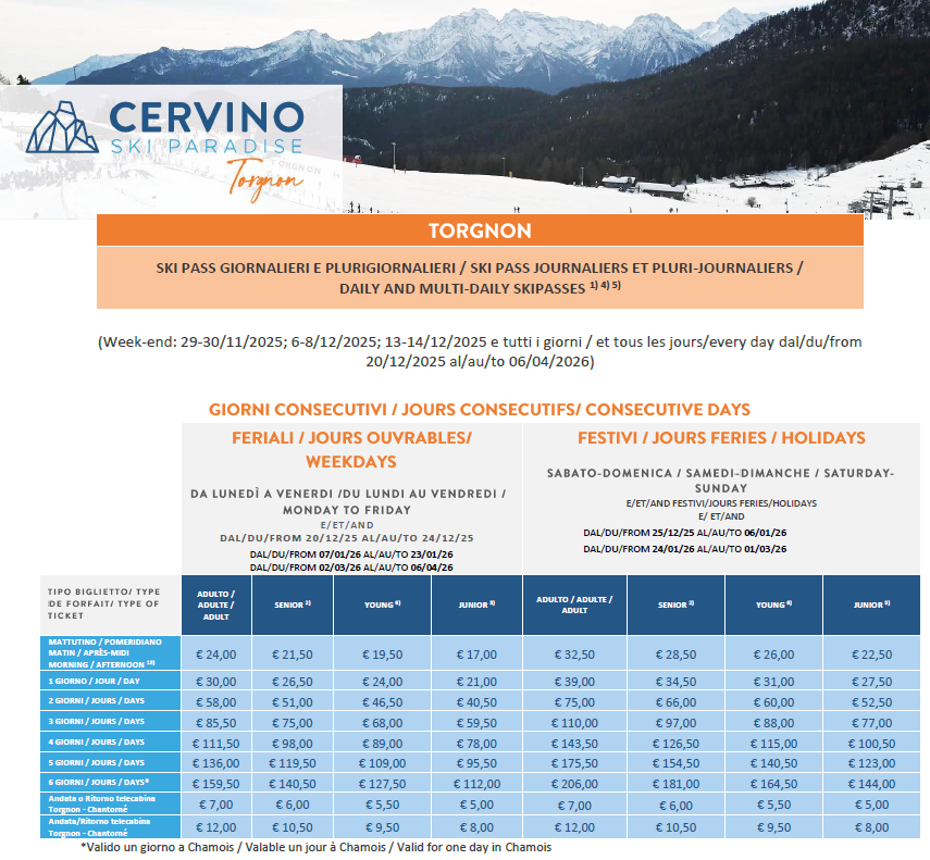 LISTINO PREZZI SKIPASS TORGNON 2025 - 2026
