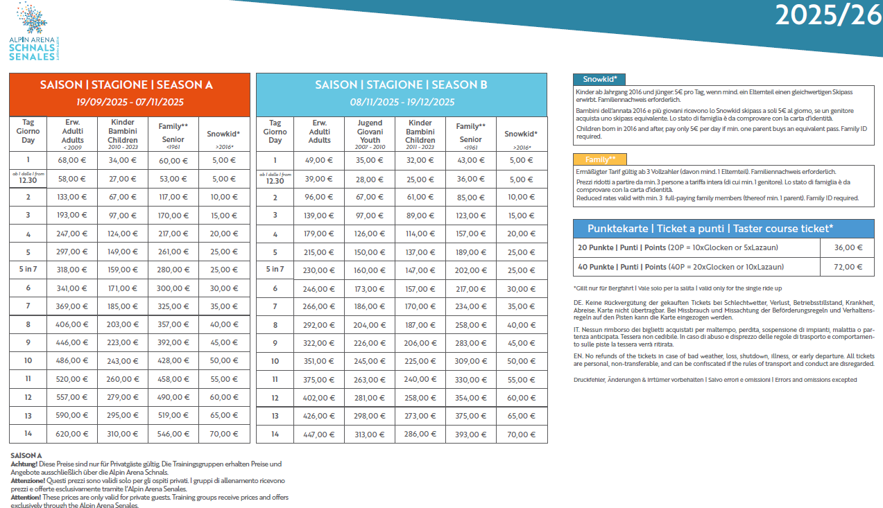 PREZZI SKIPASS VAL SENALES 2025 - 2026