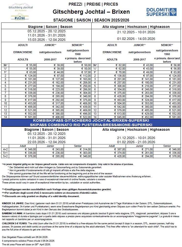 LISTINO PREZZI SKIPASS 2025 - 2026