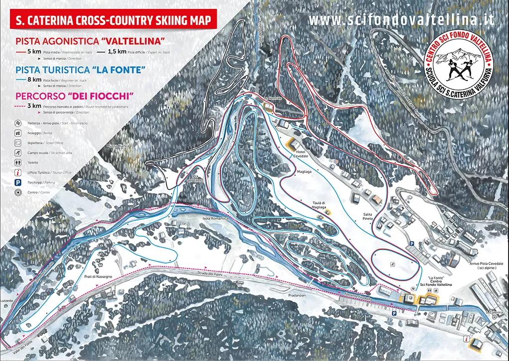 Santa Caterina di Valfurva offre un attrezzato centro fondo con tanti chilometri di piste tracciate da percorrere sci ai piedi. A 1800 metri di quota la pista Valtellina, che corre parte nei boschi di abete, parte in campo aperto, offre anelli da 5 e 10 km per lo sci di fondo che vanno a coprire rispettivamente dislivelli di 190 e 390 metri. La pista agonistica, caratterizzata da una ripida discesa particolarmente apprezzata dai fondisti esperti, è stata curata da Benito Moriconi, allenatore della nazionale e dall'ex campionessa Manuela Di Centa. Chi non si vuole cimentare nel tracciato agonistico troverà itinerari da 2, 3 e 5 km "turistici" con neve sempre eccelelnte grazie alle quote elevate. Il centro fondo La Fonte offre poi tutti i servizi nevessari, dalla Scuola sci, al noleggio, agli spogliatoi con doccia, wax room e deposito.