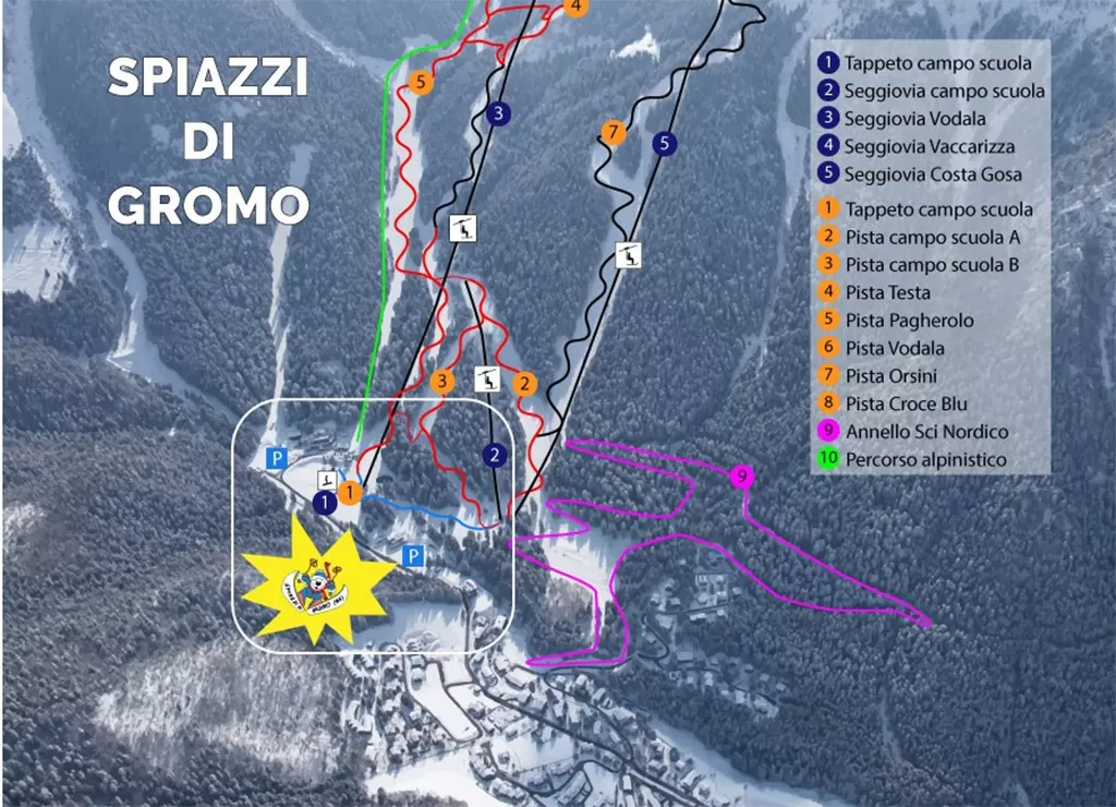 A Spiazzi di Gromo, in Val Seriana (Bergamo), si trova un anello per lo sci di fondo da 7,5 km con alcune varianti di diversa difficoltà. La partenza della pista si trova nei pressi degli impianti di risalita che servono la piccola ski area. La pista da fondo si trova a circa 1200 metri e la vedete segnalata in fucsia nella skimap qui sopra.