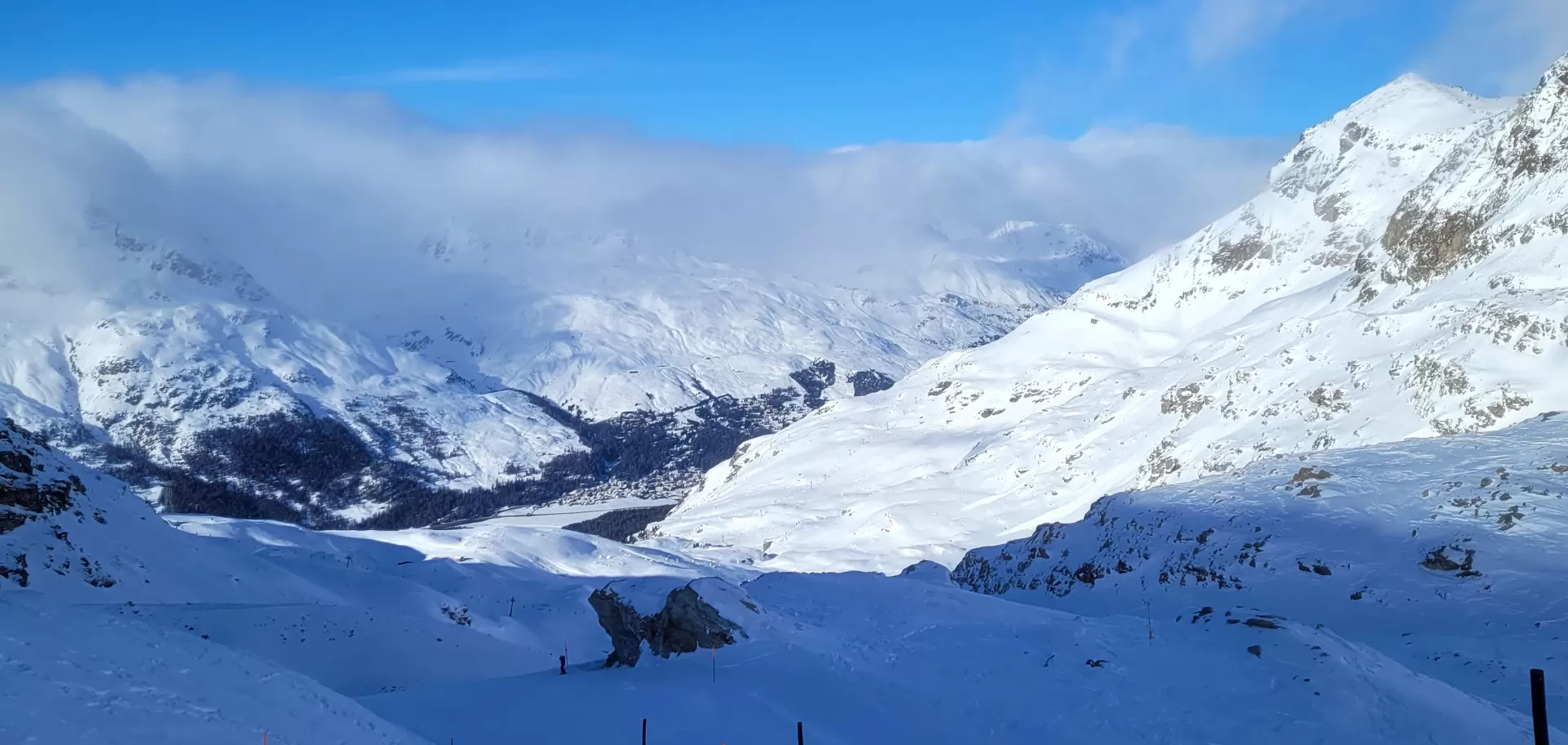 Di nuovo in pista a St. Moritz! Abbiamo visto che il Corviglia è “super sci” in campo aperto, a vocazione agonistica, ma è anche leisure, sole e mondanità. E l’altro versante? Il Corvatsch-Furtschelass, dall’altra parte, è forse ancora più movimentato e impegnativo, con un’esposizione generale tendente a nord ovest che favorisce la qualità della neve. Possiamo salire da Surlej vicino a Silvaplana o più avanti da Furtschellas, poco fuori Sils Maria. Scelgo la seconda opzione, poi capirete perché. A tappeto, proverò tutte le piste e i collegamenti relativi, come sempre faccio in queste occasioni di esplorazione di comprensori. Panorama da non credere, salendo in funivia, sui laghi di Sils, verso i passi Maloja e, di fronte, Julier e il Piz d’Err. Mi scaldo in alto sulle piste tecniche della seggiovia Furtschellas, al cospetto di tale maestosa vista. Mi sposto ora verso Surlej stando alto in una stradina a mezza costa fa massi e mammelloni di neve, e mi ritrovo sulla rossa Curtinela. La faccio fino in fondo. Però la voglio ripetere, perché secondo me è la più appagante della ski area: permette belle carvate in sicurezza. Poi è la volta della rossa Chastelets, servita dalla seggiovia Alp Surlej. Ed ecco che ora è il momento della salita in vetta del Corvatsch a circa 3300 m, raggiunta dal secondo tronco della funivia. Vista Bernina da una parte, al di là del solco della val Rosegg, e… il resto del mondo dall’altra. Pranzo ‘sospesi’ accanto alle vetrate panoramiche del ristorante in quota, dove c’è la curiosità di una distilleria di whisky e altri liquori più alta del mondo (forse). Sorpresa: il ristorante è di alta qualità, non una tourist trap.
