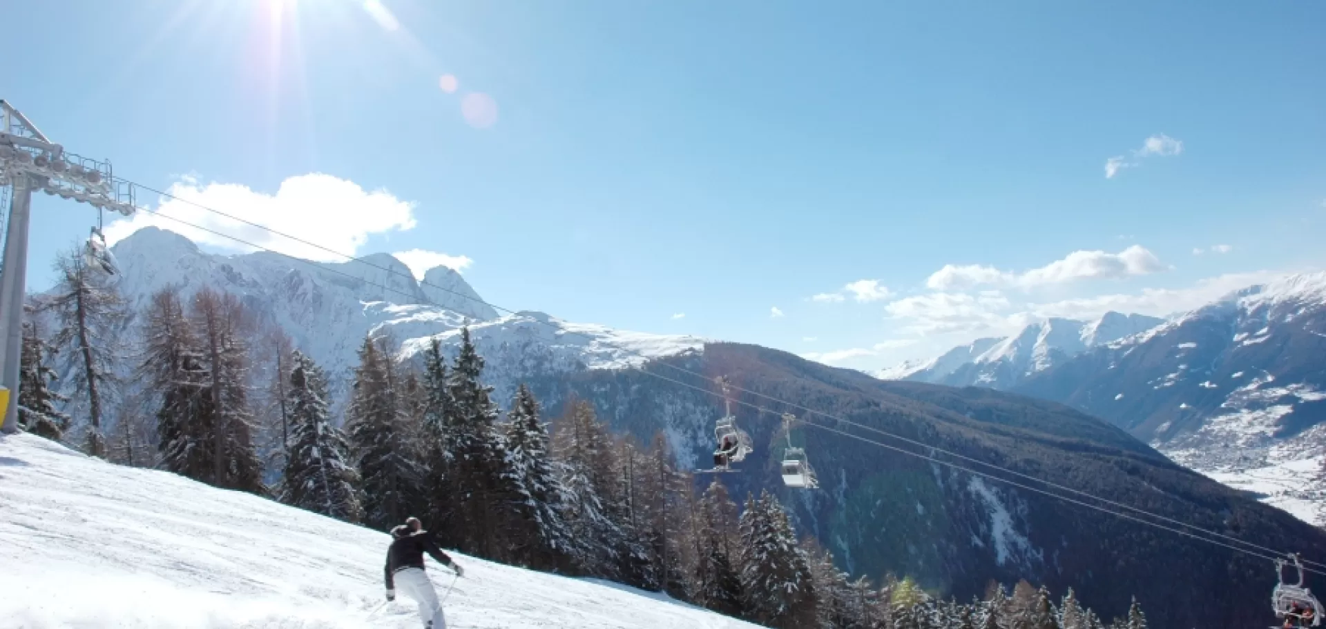 Al cospetto della natura del Parco nazionale dello Stelvio e del Parco regionale dell’Adamello, le piste si snodano quindi dai 1121 metri di quota di Temù ai 3000 metri del Presena, attraverso Ponte di Legno e il Tonale. La cabinovia Presena, inaugurata due anni fa, impiega solo 7 minuti per collegare i 2585 metri del Passo Paradiso al Passo Presena, dove il panorama lascia a bocca aperta (poiché spazia su Adamello, Lobbie, Presanella e Pian di Neve, il più vasto ghiacciaio delle Alpi italiane). Se si parte da Ponte di Legno, il viaggio sospeso sulle cabinovie dura 27 minuti per le nevi perenni del Presena. Da qui ci si può cimentare in una delle discese continue più lunghe d’Europa, una “non stop” di 11 km fino a Ponte di Legno con un dislivello possibile di ben 1900 metri (cercate dove è possibile nel nostro database e farete fatica a trovare una pista simile): si inizia con la pista del ghiacciaio Presena che per essere un ghiacciaio è un bel muretto, poi un po’ di stradina con la variante blu oppure più diretti sulla rossa Presena-Paradiso. Poi arriva la Paradiso spacca gambe, 3 km di nera senza tregua, ma per fortuna ci aspetta la riposante Tonalina, fino all’ultimo strappetto un po’ più impegnativo della Pegrà. Da qui si risale con la seggiovia Sozzine sulle piste del Corno d’Aola- Valbione, sopra il paese, allungando ulteriormente la sciata. A meno che per rientrare a Ponte di Legno non si voglia spingere a margine degli anelli del centro fondo… Ma non è il caso.