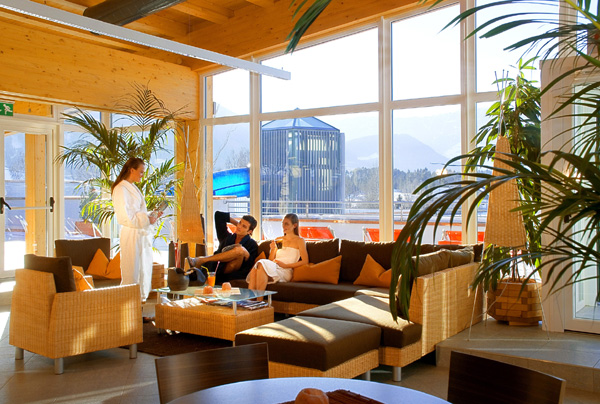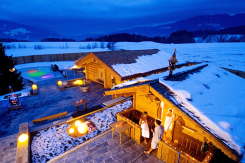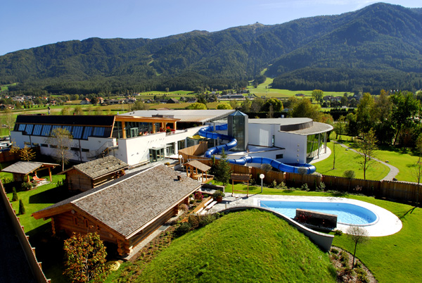 • Area esterna, sauna: ampia sauna finlandese, sauna per la gettata di vapore (finlandese, 90°) in grado di accogliere circa 70 persone, sauna “malga alpina” (finlandese, 85°) al profumo di fieno fresco, sauna dei Vichinghi (finlandese, 100°) con trono, baita Tre Cime (finlandese, 90°) con stufa a legna, sauna seminterrata con mura in pietra (80°, in parte intorno al regno della terra), ampia tinozza con acqua fredda, percorso Kneipp, bagno alle braccia Kneipp, ampio giardino con sdraio, focolari aperti.